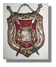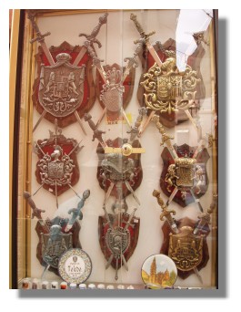 托雷多古城區∼(左圖)皇家徽章雙劍吊飾 (右圖)在商店的櫥窗上吊飾 走在托雷多古城區裡,除了看美麗壯觀的教堂.城堡...外,更可沿途欣賞托雷多著名的手工刀劍藝品,像Magic站長看到左邊那一個精緻的吊飾,就被它獨特的花紋給吸引,再打聽它的價位,還算合理(大概28歐元左右),於是就..又..給..它..包..起來囉! |