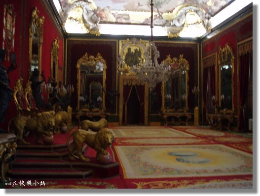 19. 王位廳(洛可可式)1 : 天花板的壁畫是1764年威尼斯畫家提耶波羅的作品, 牆壁貼有銀絲繡成花邊的紅色錦鍛o 除此之外還有布置家具. 時鐘. 鏡子. 代表四樞德 (智. 義. 勇. 節)的雕像, 代表七大行星的雕像o 掛有皇宮最珍貴的威尼斯銀製水晶吊燈o