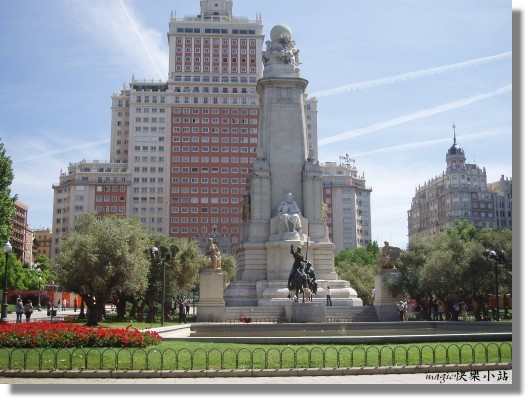 60. 西班牙廣場Plaza de Espana : 位於卡藍大道的底端, 非常靠近皇宮, 是馬德里市中心最漂亮寬敞的廣場之一o 中間白色紀念埤石像部份,則是來紀念唐吉訶德的作家~米蓋爾塞萬提斯.沙維德拉(1616年卒於馬德里)o 是20年代的雕刻家~科遙.瓦雷拉的作品o 紀念埤的前方設有兩座青銅像, 一座是唐吉訶德.拉查曼, 另一座是他的隨從山卓.潘沙o 中央前面豎立著唐吉訶德的騎馬像o