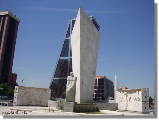 68. 卡斯提亞廣場 : 廣場中間有一座噴泉和一座紀念政治家霍華金卡爾沃德羅的雕像o 而廣場後面的兩座互相傾斜的大樓就是~"歐洲之門"o