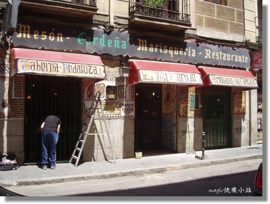 79. 太陽門廣場8 : 這是附近餐廳門口, 裡面的商店真的非常多, 及價位便宜o 像站長在此廣場的商店百貨裡, 買了西班牙名牌的Zara衣服, 剛好它們有大折扣活動, 所以站長在此買了一大袋Zare衣服, 總價還不超過50歐元哩! 真是買到賺到哦! @_<