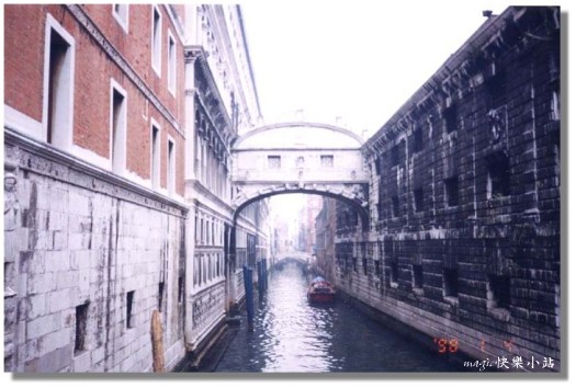 該橋大約1602年建成, 在數個世紀中它一直是一條令人抑郁的通道o 囚犯們從監獄提到法庭審訊時, 總要被迫走過它, 審訊後再回到窄小黑暗的牢房時還要再穿過它o 犯人們過橋時往往發出嘆息, 因而得名o 嘆息橋是昔日犯人處決前與世人決別的場所,今日則是觀光客絡繹不絕的景點。 |